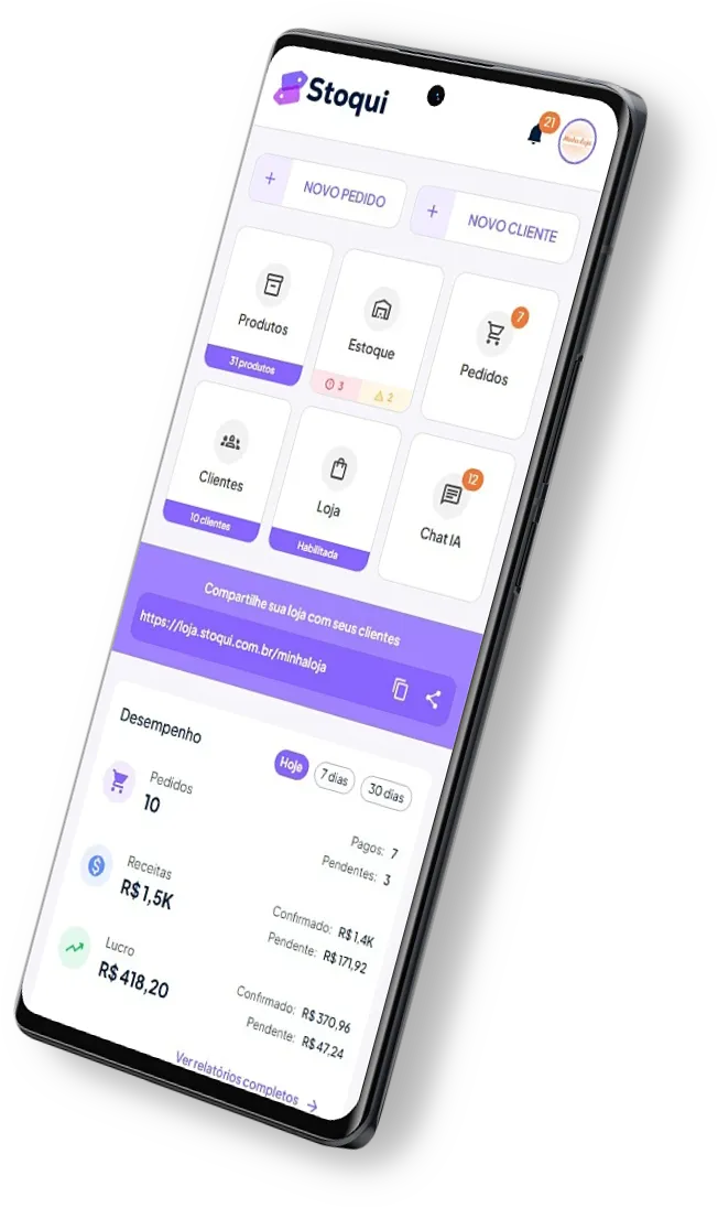Com o app Stoqui você tem tudo o que precisa na palma da mão: controle de estoque, pedidos, clientes, relatórios e muito mais. Acompanhe suas vendas em tempo real e simplifique sua rotina com praticidade.